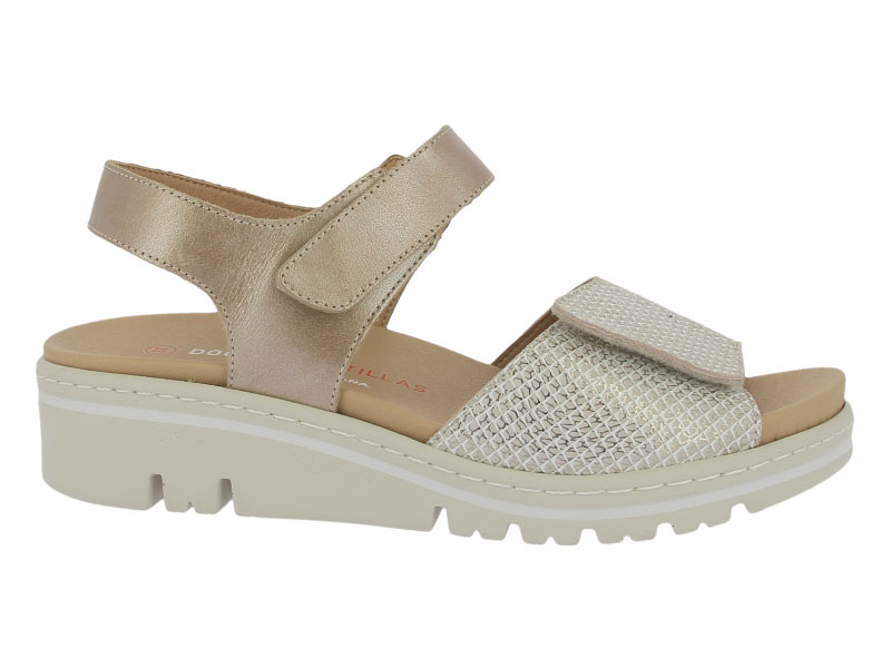Sandalia de cuña para mujer fabricada en combinación de piel lisa efecto metalizado y estampada en color . Ofrece cierre con doble velcro para un ajuste óptimo al pie, plantilla de microfibra extraíble de alta densidad y suela de poliuretano.Tallas hasta el 41